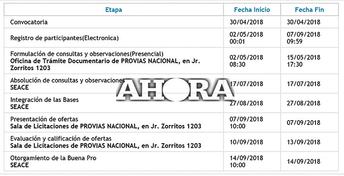 Con el nuevo cronograma en vigencia, a partir de la integración de las bases que rigen desde el 27 de agosto, se determinó que la presentación de ofertas se efectuará el viernes 7 de setiembre a partir de las 10:00 de la mañana. La siguiente fase de evaluación y calificación de ofertas está previsto desde el lunes 10 al jueves 13 de setiembre, apenas cuatro días, y para el 14 de setiembre se determinó la fecha para conocer al ganador del proceso.