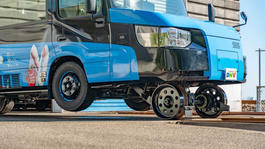 Circula con neumáticos normales por la carretera. Pero cuando llega a un intercambiador, unas ruedas de acero descienden desde los bajos del vehículo hasta la vía férrea, convirtiéndolo en un vagón de tren.