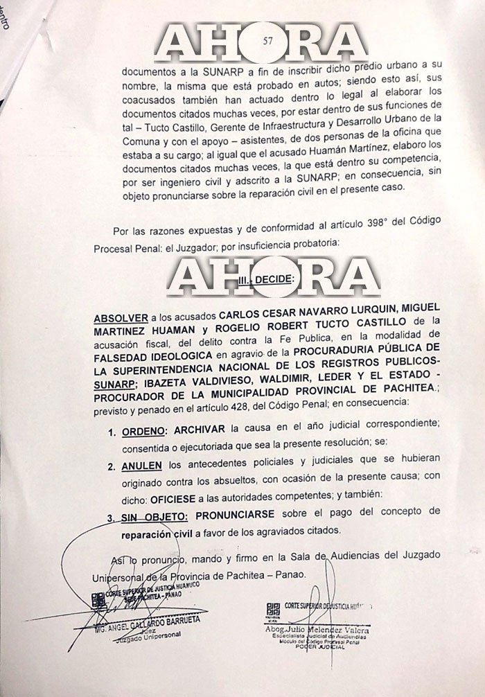 El Juzgado Penal Unipersonal de la Provincia de Pachitea, a cargo del magistrado Ángel Gallardo Barrueta, decidió absolver de la acusación fiscal por el delito contra la fe pública, en la modalidad de falsedad ideológica, a los ciudadanos Carlos César Navarro Lurquín, Miguel Martínez Huaman y Rogelio Robert Tucto Castillo.