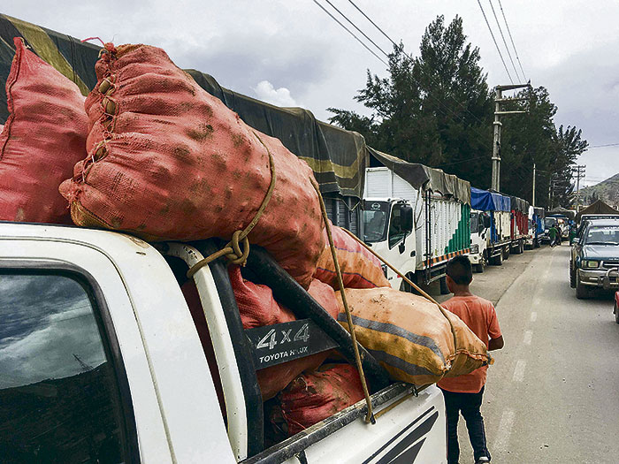 Con sus camiones llenos de papa los agricultores exigieron a Agro Rural que compren sus productos. Jhon Santa María dijo que los productores tienen fichas de compra programados hasta el viernes pero hay incertidumbre si se va a continuar con las compras de papa blanca.