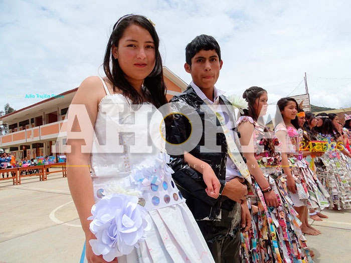 Con el objetivo de concientizar a la comunidad educativa y a la población de Chaucha, en la provincia de Ambo, sobre el cuidado del medio ambiente, los estudiantes de la Institución Educativa Jorge Chávez Dartnell, revolucionaron el arte de la modistería al confeccionar un vestido de novia de papel. También confeccionaron el terno y la corbata del novio.