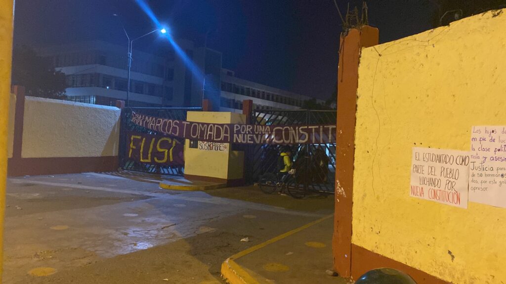 La madrugada de hoy miles de estudiantes de la Universidad Nacional Mayor de San Marcos (UNMSM) tomaron el campus universitario. Los alumnos de la Federación Universitaria de San Marcos (FUSM) se ubican en la puerta número 3 en donde mostraron su solidaridad sobre las protestas en diversas regiones del país.