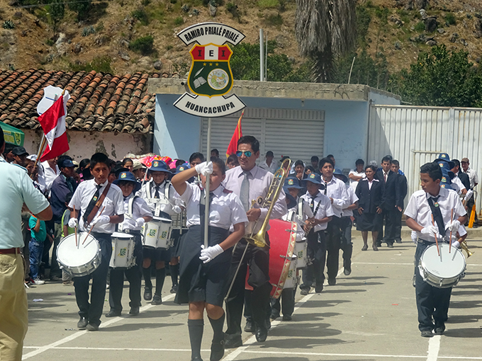 Las escoltas de las I. E. de Gabriel Aguilar Nalvarte, Condormarca, Aplicación Rural de la Unheval (Huancayacu) y Huampom se esforzaron en realizar las evoluciones al ritmo de sus bandas de música. Además, estuvieron acompañados de docentes y batallones de damas y varones.