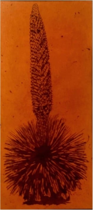 En otro lado de la sala, el lanzón Chavín y la Puya Raimondi realizados en un tinte negro sobre la tela teñida en un fondo nogal se actualizan de tal manera que en el recinto donde se encuentran, piedra y planta son la imagen sintética de dos íconos, la primera personifica a la deidad receptora de un sin número de ofrendas de corazones latiendo y la segunda expresa a esta planta que tarda cien años en mostrarnos su floración; muerte y vida, vida y muerte según el lado donde se ubique.