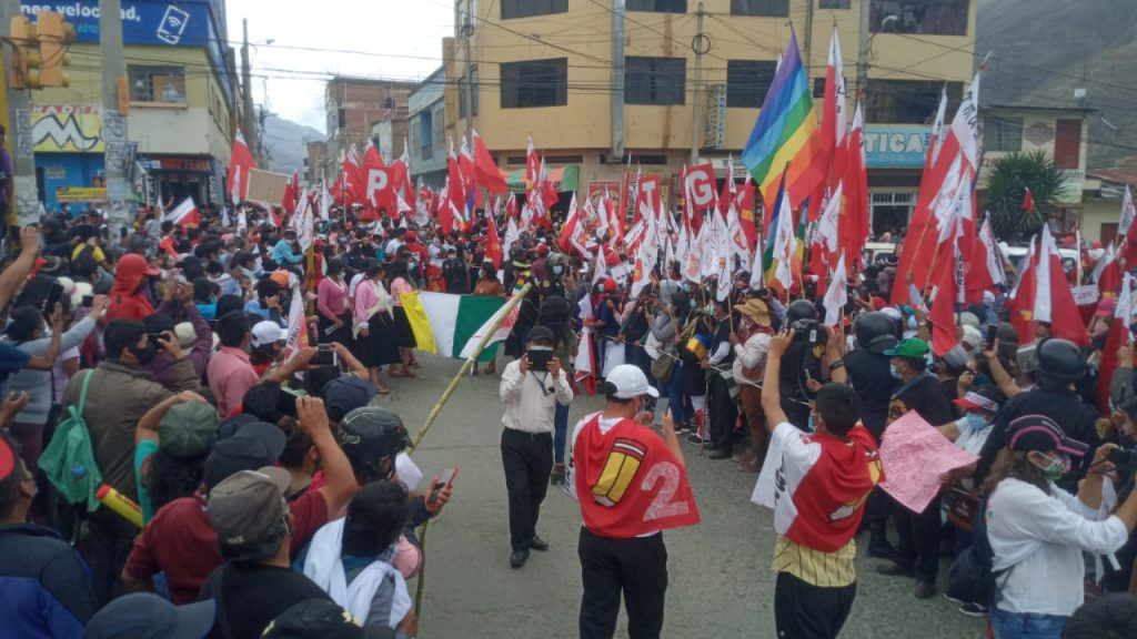 En ese momento, una turba de personas ingresó gritando por el jirón Dos de Mayo. La gente corría, las bocinas de los carros comenzaron a sonar: ti, ti, ti, ti ti; ti, ti, ti, ti ti. Aceleré los pasos para poder ver al candidato que ingresaba a nuestra ciudad. La gente gritaba, eufórica. Muchos estaban sin mascarillas. El distanciamiento, por supuesto, no existía. Pero qué importaba, si estaba ingresando su salvador. Comencé a mirar por todos lados, y rogué que apareciera el gordito con su bandera naranja para ver qué le sucedería. Nunca apareció. Traté de alejarme lo más que pude, pero me fue casi imposible. Había tanta gente, me paro al lado de dos ciudadanos que conversan acaloradamente.