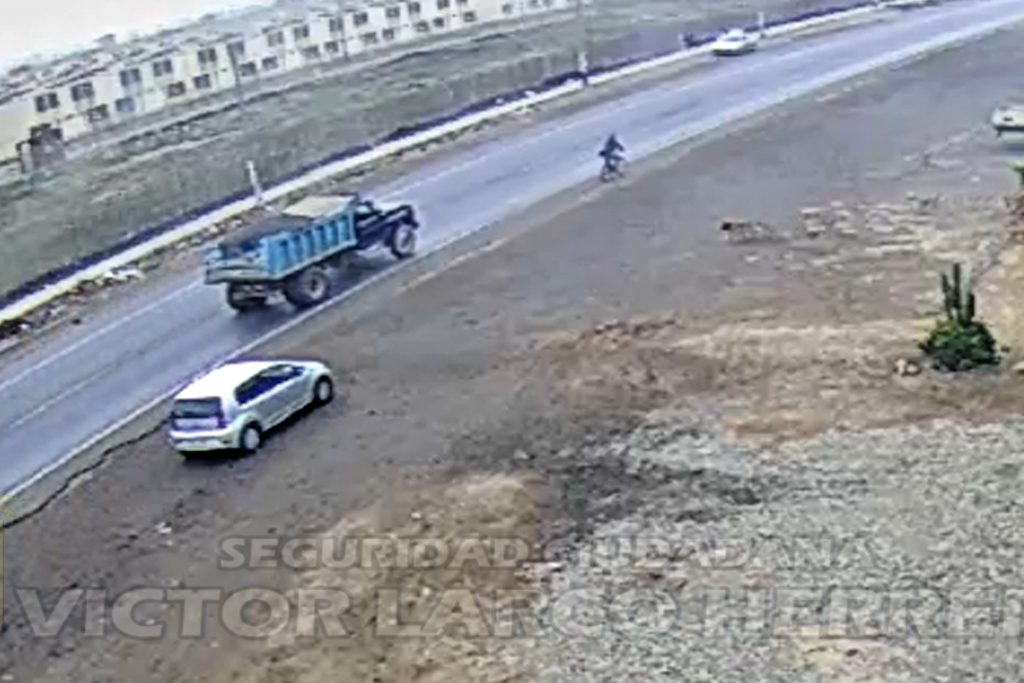 El irresponsable conductor sale de la carretera para adelantar a unos camiones en Trujillo. Avanza a velocidad, y de pronto pasa un rompemuelles. Unos perros se salvan de ser arrollados, pero un ciclista no tiene la misma suerte.