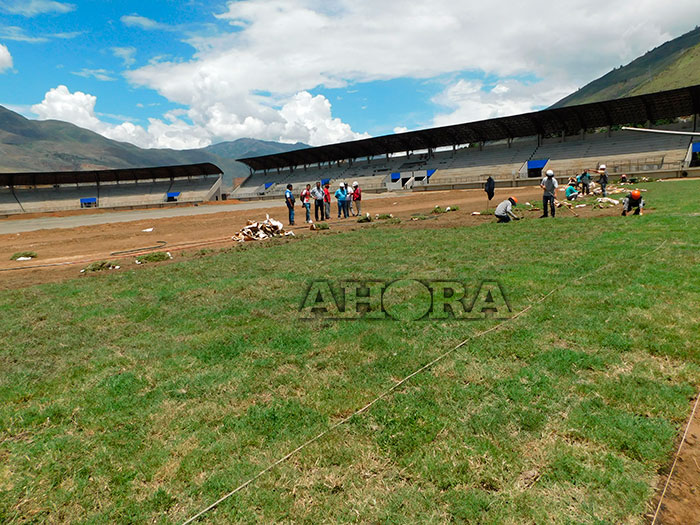 Al llegar a este fin de semana, el trabajo de colocación de grass natural al campo de fútbol de Complejo de Paucarbamba llega con bastante avance. Hasta ayer se había completado las tres cuartas partes del área del campo y la hierba colocada en los primeros días viene desarrollándose satisfactoriamente gracias al tratamiento especializado con nutrientes que lo hacen enraizar rápidamente y crecer de la misma manera.