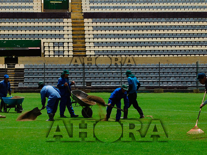 En el campo se observa que las partes donde la hierba había desaparecido y en los huecos se ha colocado champas en reemplazo. Asimismo, los baches y ondulaciones que presentaba la cancha están siendo nivelados rellenando con tierra negra que luego es apisonada. Todo ello forma parte de un trabajo especializado que se complementa con riego abundante. Mañana jueves un rodillo mecánico pasará sobre la cancha y con ello ya tendrá un mejor aspecto, aunque se tendrá que esperar que se compacte el piso y que la hierba crezca para lo cual no debe haber ninguna actividad.