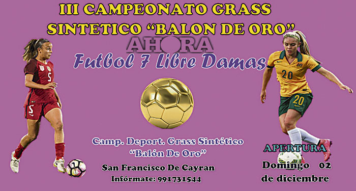 El III Campeonato Grass Sintético “Balón de Oro” de fútbol 7 libre para damas, comenzará el próximo domingo 2 de diciembre en el indicado local, cuyas inscripciones están abiertas en el mismo lugar o se puede hacer llamando al teléfono celular 971731544. El cupo para participantes es de un máximo de 16 equipos.