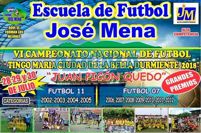 Los días 28, 29 y 30 de julio, con motivo de las Fiestas Patrias, en Tingo María se realizará el VI Campeonato Nacional de Fútbol de Menores Tingo María Ciudad de la Bella Durmiente”, organizado por la Escuela de Fútbol José Mena, aprovechando las vacaciones escolares de medio año.