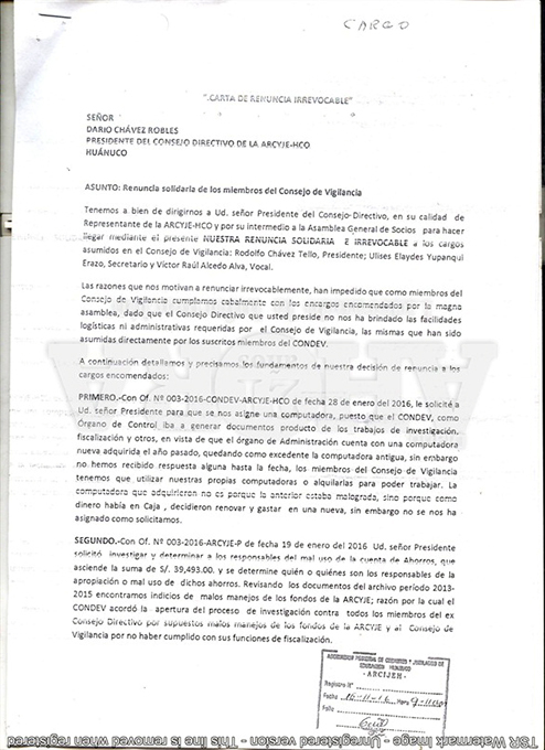 Condev, en reiterados oficios e incluso mediante cartas notariales, ha solicitado a Darío Chávez, como presidente de Arcyje, notifique y cite a los exdirectivos para que informen el destino de los S/39 493.00, pero para sorpresa del Comité de Vigilancia, la respuesta fue que no era su facultad fiscalizar la anterior gestión “porque ellos tuvieron su propio comité de vigilancia”. Incluso las cartas notariales les fueron devueltas.