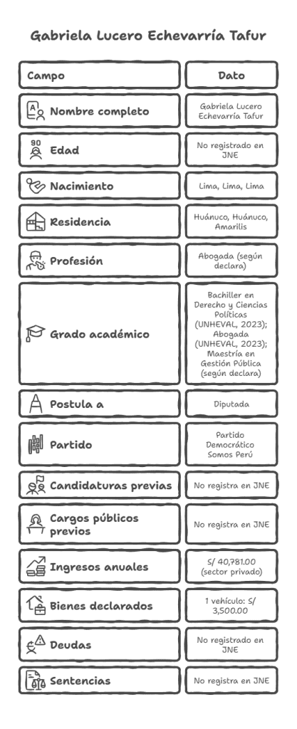 Vive en Amarilis, en Huánuco, pero su lugar de nacimiento figura en Lima. Gabriela Lucero Echevarría Tafur registra formación técnica en Senati y, más recientemente, estudios en Derecho en la Universidad Nacional Hermilio Valdizán. Hoy postula al Congreso como candidata a diputada por el Partido Democrático Somos Perú. Su declaración jurada ante el Jurado Nacional de Elecciones (JNE) consigna su experiencia como abogada desde 2023, sus ingresos anuales y un bien vehicular declarado.