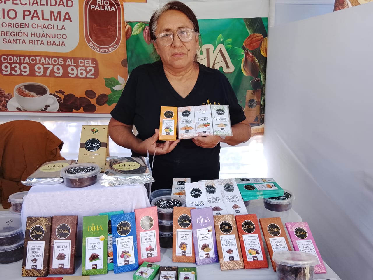 Entre los productos exhibidos, la marca “Diha” presentó una colección de chocolates con insumos poco convencionales, como sacha culantro, naranja con café, aguaymanto con maíz tostado, pitahaya y hierba luisa. Esta iniciativa fue impulsada por Marisa Solís Cabrera, ingeniera de la provincia de Leoncio Prado, quien lidera una planta de producción artesanal en el distrito de Castillo Grande.