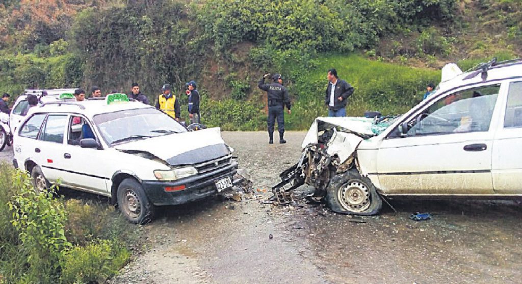 Dos vehículos colectivo colisionaron violentamente y dejaron 8 heridos, dos de ellos de gravedad. El accidente de tránsito ocurrió ayer en horas de la mañana en una curva de la localidad de Yuncapalla, en el distrito de Panao. El automóvil Toyota Corolla de placa B8O-694 conducido por Víctor Trujillo Sumarán (65) se desplazaba de Molino a Panao, y en la curva se topó con el vehículo Toyota de placa A2J-174, conducido por Fidel Alania Orizano (34) que iba en sentido contrario y colisionaron bruscamente.