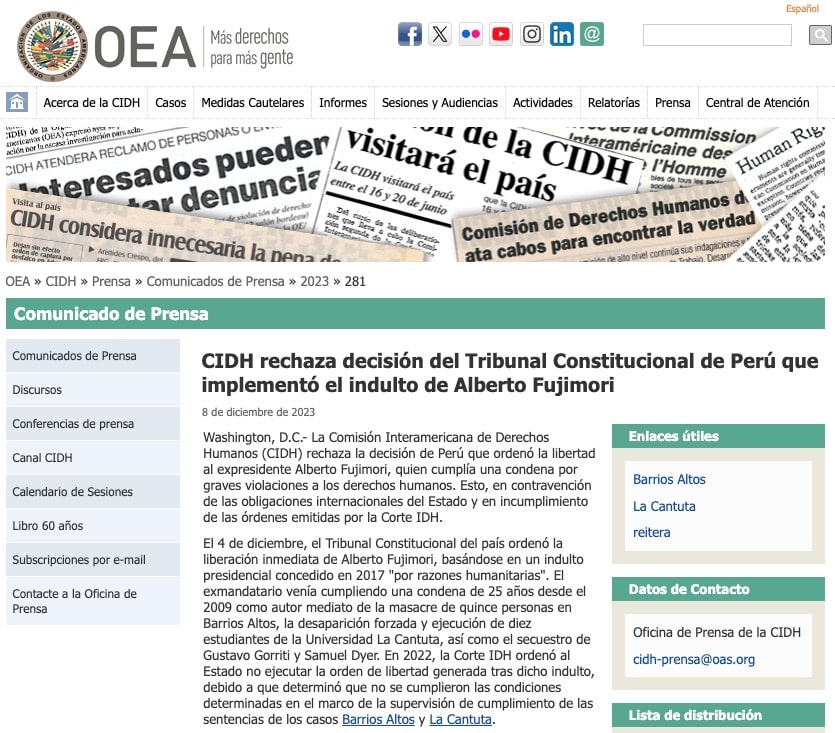 Washington D.C., 8 de diciembre.- La Comisión Interamericana de Derechos Humanos (CIDH) emitió un comunicado rechazando la reciente decisión del Tribunal Constitucional de Perú que ordenó la libertad del expresidente Alberto Fujimori, quien cumplía una condena de 25 años por graves violaciones a los derechos humanos.