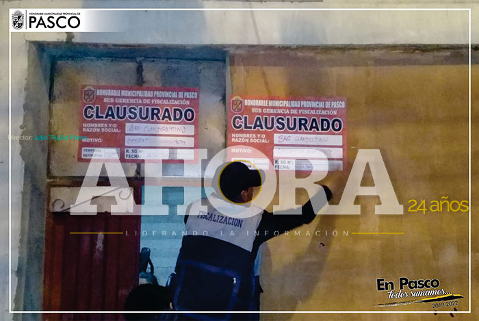 Personal de la Subgerencia de Fiscalización de la Municipalidad Provincial de Pasco clausuró el bar denominado «Las Gatitas», ubicado en la avenida Circunvalación Arenales, en el distrito de Chaupimarca.