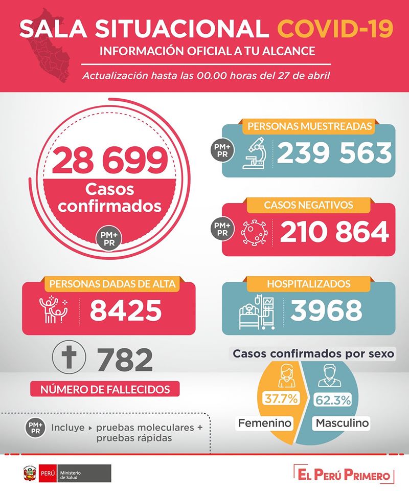Cifra de muertos se eleva a 782 y casos positivos suman 28 699