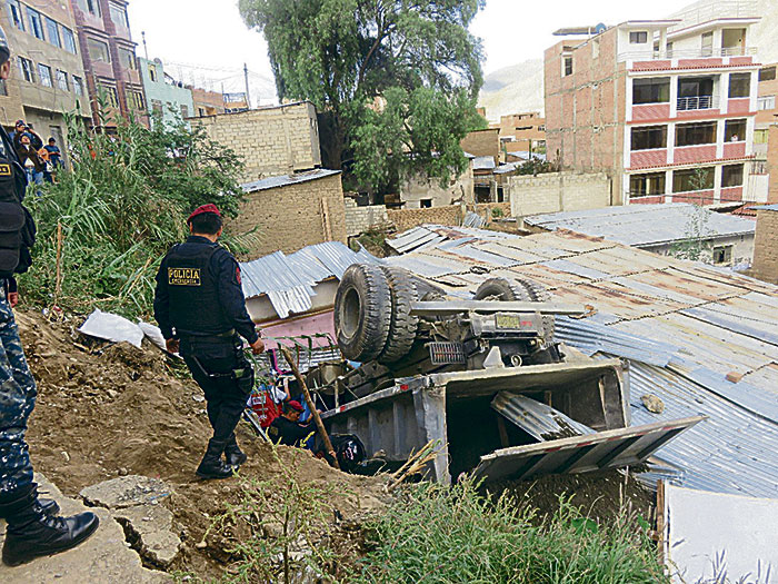 Testigos informaron al diario AHORA, que el pesado vehículo pasaba tratando de esquivar un montículo de tierra, por el jirón Esteban Pavletich, cuando, al pegarse al borde de la vía, el piso cedió y se precipitó sobre el techo de la vivienda.