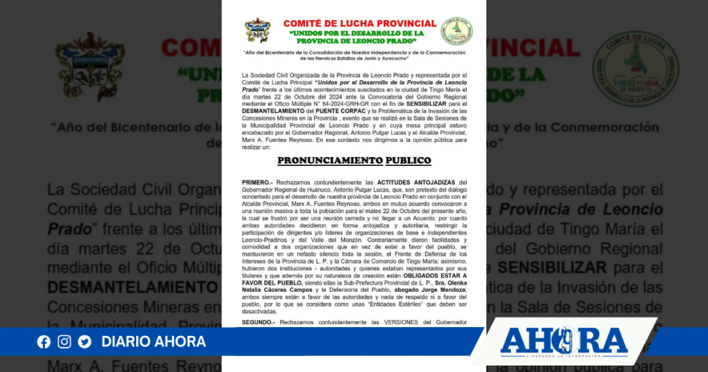 El Comité de Lucha Provincial “Unidos por el Desarrollo de la Provincia de Leoncio Prado” emitió un pronunciamiento público en el que critica las acciones del gobernador regional de Huánuco, Antonio Pulgar Lucas, y del alcalde provincial, Marx A. Fuentes Reynoso. El documento, firmado por representantes de organizaciones de base de Leoncio Prado y del Valle de Monzón, expresa la preocupación de la sociedad civil organizada ante lo que consideran decisiones arbitrarias y perjudiciales para la población.