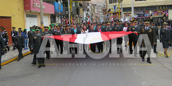 En el estrado principal estuvieron las principales autoridades, excepto el gobernador regional Juan Alvarado Cornelio, quien viajó a Lima a  invitación del presidente de la República, Martín Vizcarra, para participar de la Misa Te Deum en la Catedral de Lima.
