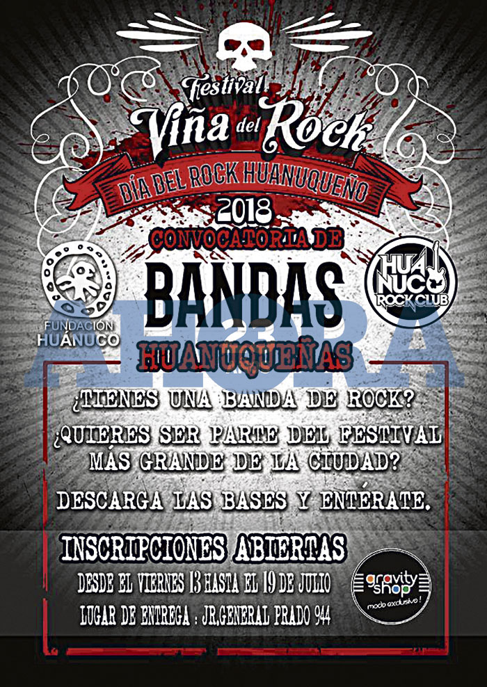 La organización Huánuco Rock Club está convocando a las bandas huanuqueñas a participar de la convocatoria pública para seleccionar a los grupos que se presentarán este 13 de agosto en el décimo sexto festival Viña del Rock por el Día del Rock Huanuqueño.