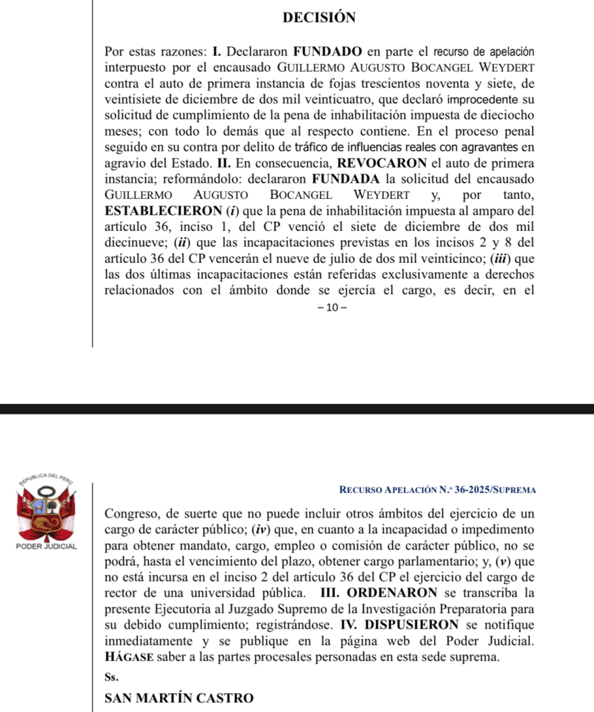 Sobre este punto, la resolución indica: “Las dos últimas incapacitaciones están referidas exclusivamente a derechos relacionados con el ámbito donde se ejercía el cargo, es decir, en el Congreso, de suerte que no puede incluir otros ámbitos del ejercicio de un cargo de carácter público”. Así, se confirma que, pese a seguir vigente la inhabilitación parcial, Bocangel podría ejercer funciones fuera del Congreso.