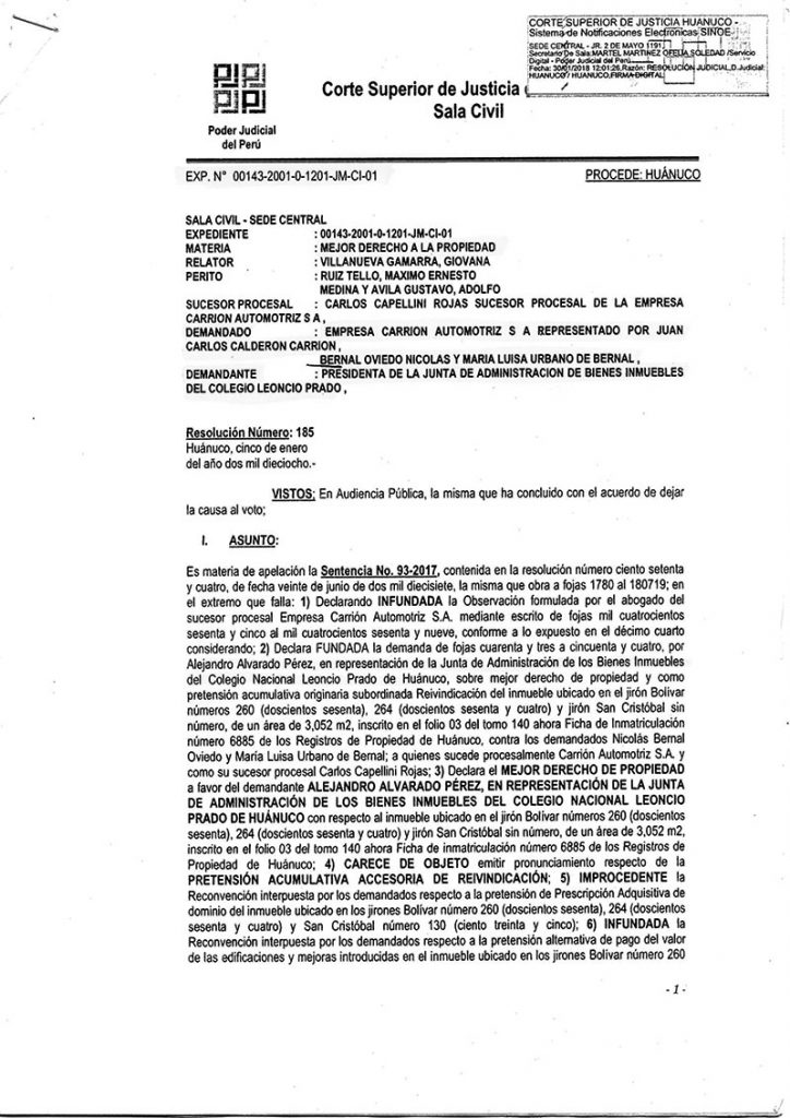 La demanda de Alejandro Alvarado Pérez, presidente de la Junta de Administración de los Bienes Inmuebles de la G.U.E. Leoncio Prado de Huánuco, en contra de Nicolás Bernal Oviedo y María Luisa Urbano de Bernal, resuelve (Sentencia n.° 93-2017) el Mejor Derecho a la Propiedad a favor del demandante, sobre el bien inmueble ubicado en el jirón Bolívar n.° 260 y 264 y Jr. San Cristóbal S/N, de un área de 3052 m2.
