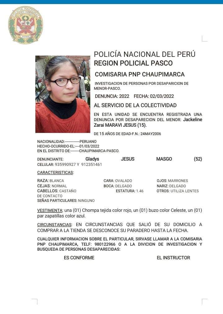 Los preocupados familiares de Zaraí Maraví Jesús, de 15 años de edad, denunciaron su desaparición el pasado 1 de marzo. La menor salió de su vivienda a comprar en una tienda cercana. Al momento de su desaparición vestía una chompa roja, un buzo celeste y zapatillas de color azul.