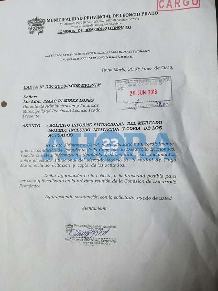 Se comprobó que el 20 de junio del año en curso, el referido concejal con carta 024-2018-P-CDE-MPLP/TM, solicitó un informe detallado y sustentado con documentos sobre el estado situacional del mercado modelo de la ciudad, incluido un informe sobre las postergaciones y demora de la licitación con copia de los actuados; pero pasan los plazos de ley para la respuesta, la primera autoridad edil y el funcionario a cargo hacen caso omiso a lo solicitado.
