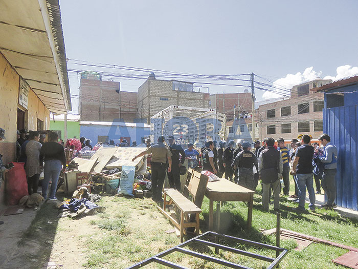 Un grupo de agentes del serenazgo y efectivos policiales llegaron a las inmediaciones del predio y, bajo la supervisión de la Procuraduría Municipal, sacaron todas las pertenencias de la madre de familia y sus hijos, y las depositaron en la calle pese al intento de impedimento de un grupo de vecinos.