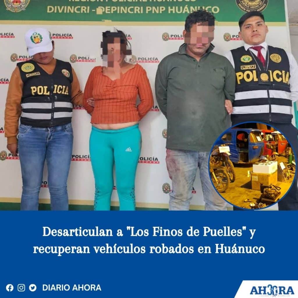 En una operación conjunta, efectivos del Área de Investigación de Robos (AREINROB) y del Departamento de Investigación Criminal (DEPINCRI) de Huánuco lograron la captura en flagrancia de dos presuntos integrantes de la banda criminal conocida como “Los Finos de Puelles”, dedicada al delito de receptación de vehículos robados. La intervención se llevó a cabo en el sector de Colpa Baja – Aeropuerto, permitiendo la recuperación de diversas unidades vehiculares y autopartes de procedencia ilícita.