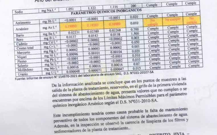 “El parámetro químico inorgánico arsénico analizado no cumple o supera los límites máximos permisibles para las muestras de agua obtenidas en los puntos de monitoreo en la salida de la planta de tratamiento, reservorio y en el grifo de la vivienda”, mencionó las conclusiones del informe.