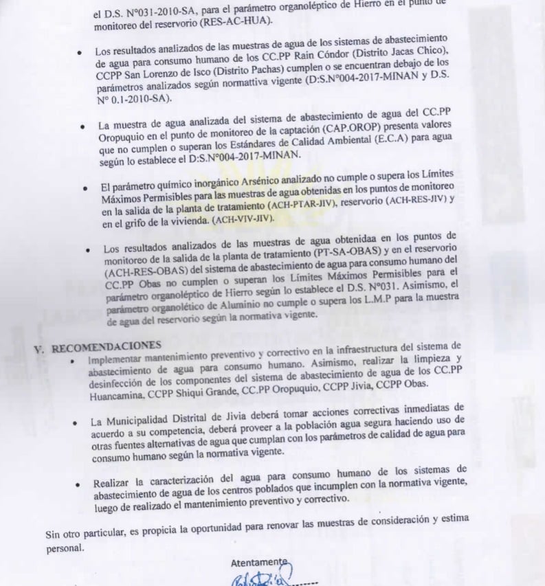 Advirtió que, según el estudio del agua de los sistemas de abastecimiento de agua para consumo humano de los CC.PP. Rain Cóndor (Jacas Chico) y CC.PP. San Lorenzo de Isco (Pachas), no cumplen o se encuentran debajo de los parámetros analizados, según normativa vigente.