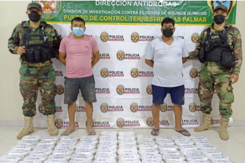 Moisés Nano Sánchez (35) y Carlos Eduardo Agüero Sánchez (27) fueron detenidos por policías del Puesto de Control Terrestre Las Palmas en la provincia de Leoncio Prado, tras ser descubiertos que transportaban cerca de 63 kilos de alcaloide de cocaína.