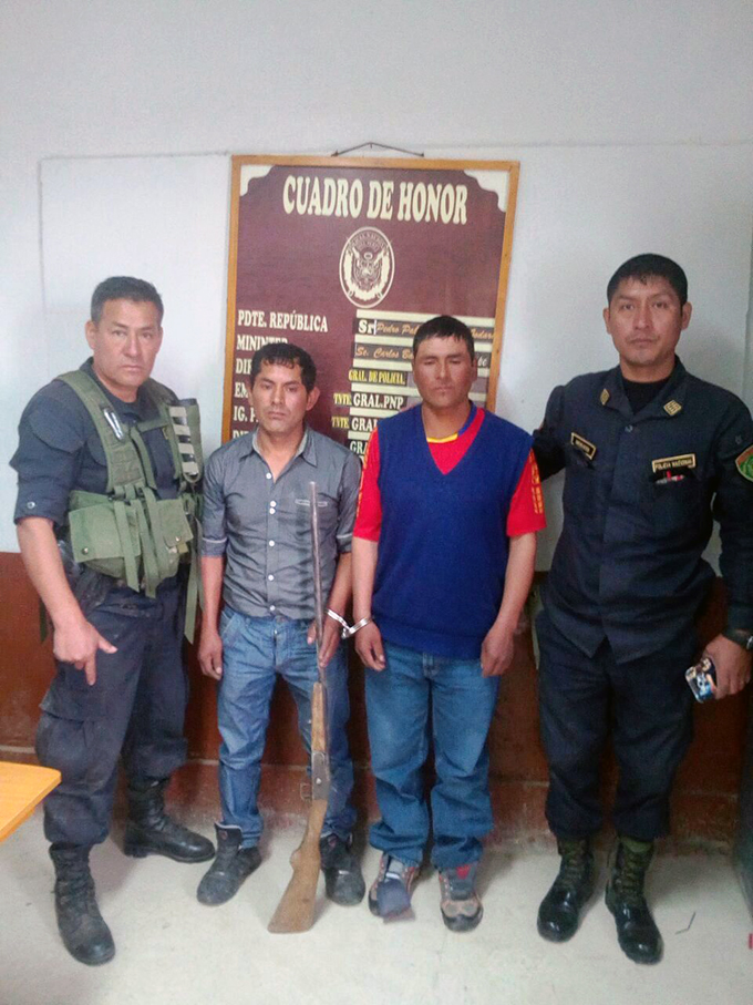 En un patrullaje realizado ayer a las 10.00 de la mañana, la policía de Rondos capturó a dos sujetos en el caserío de Huarcayog quienes fueron identificados como Niel Niler Loyola Rivera (33) y Edgar Carlos Soto Fernández (43) quienes portaban ilegalmente un arma de fuego (escopeta), que no tenía número de serie.