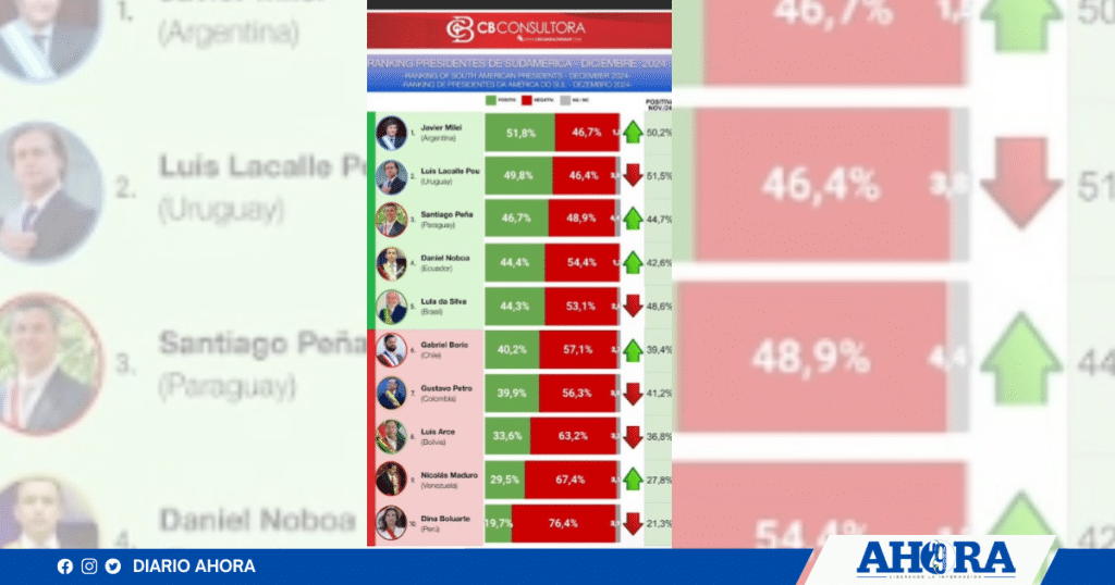 En contraste, Javier Milei, presidente de Argentina, lidera la lista con un 51.8% de aprobación, seguido de Luis Lacalle Pou de Uruguay (49.8%) y Santiago Peña de Paraguay (46.7%). En posiciones intermedias destacan Daniel Noboa de Ecuador (44.4%) y Luiz Inácio Lula da Silva de Brasil (44.3%).