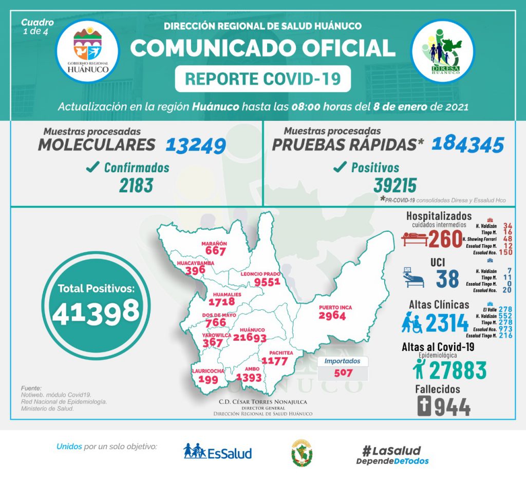 El reporteCOVID-19 región Huánuco suma 85 casos positivos y 08 fallecidos en las últimas 24 horas, de acuerdo a cifras actualizadas por la Dirección Regional de Salud hasta las 08:00 horas del día 08 de enero de 2021.