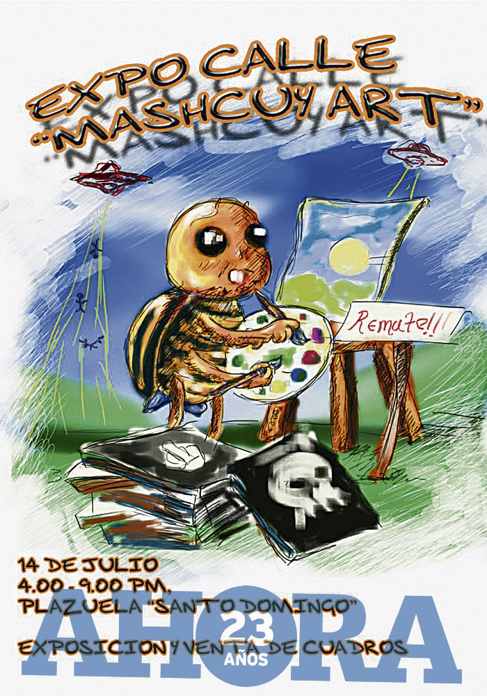 La primera expocalle “Mashcuy Art”, que tiene la temática de exposición de arte al aire libre, se realizará los días sábado y domingo, de 4 de la tarde a 9 de la noche, en el escenario de la antigua plazuela Santo Domingo, donde se exhibirán los trabajos de pintura, cerámica y adornos de 17 artistas plásticos.