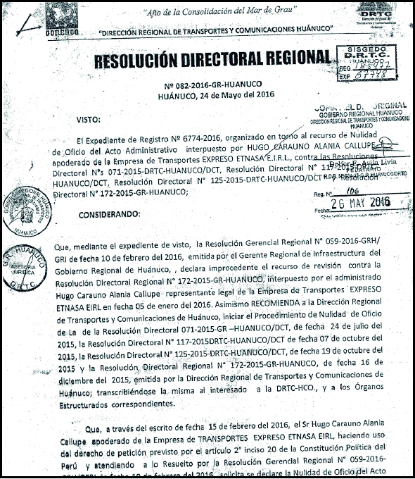 La Dirección Regional de Transportes y Comunicaciones de Huánuco, mediante Resolución n.º 082, con fecha 24 de mayo de 2016, anuló las resoluciones de autorización de circulación de vehículos con categoría M2 (miniván y combi) en la ruta Huánuco-Tingo María. El dictamen, que firmó la exdirectora regional de Transportes, Lupe Ayllón Ruiz, considera que las resoluciones de 2015, que firmó su antecesor Francisco Sara Evangelista y el director de Circulación Terrestre Lucio Romero Cóndor, fueron emitidas contraviniendo el Reglamento Nacional de Administración de Transportes.