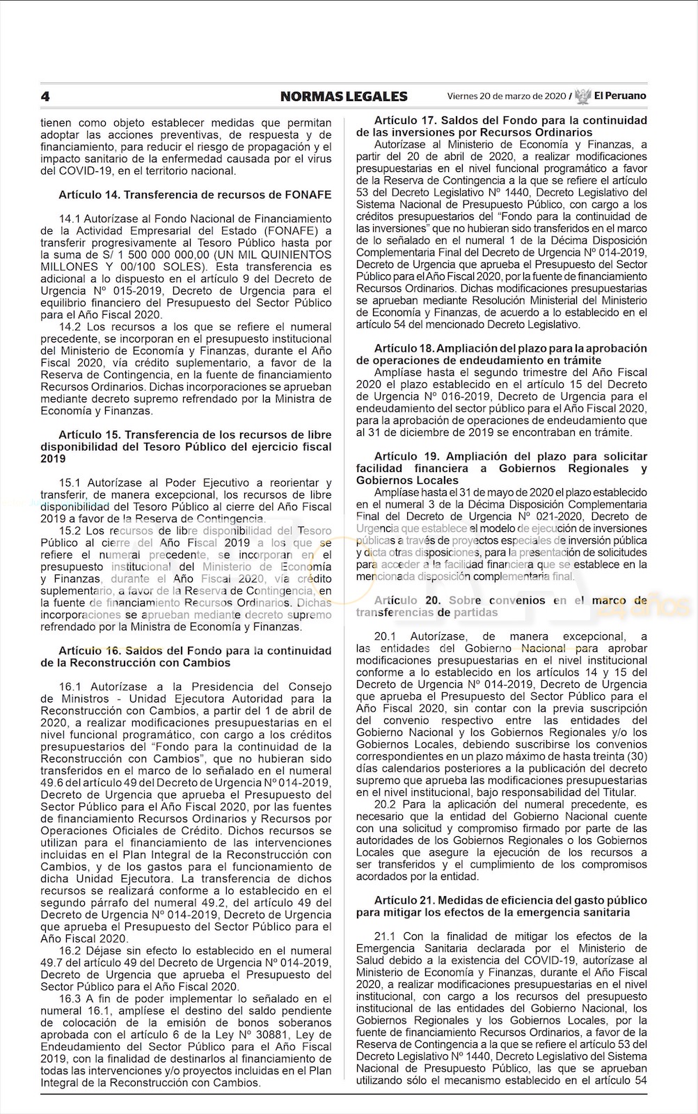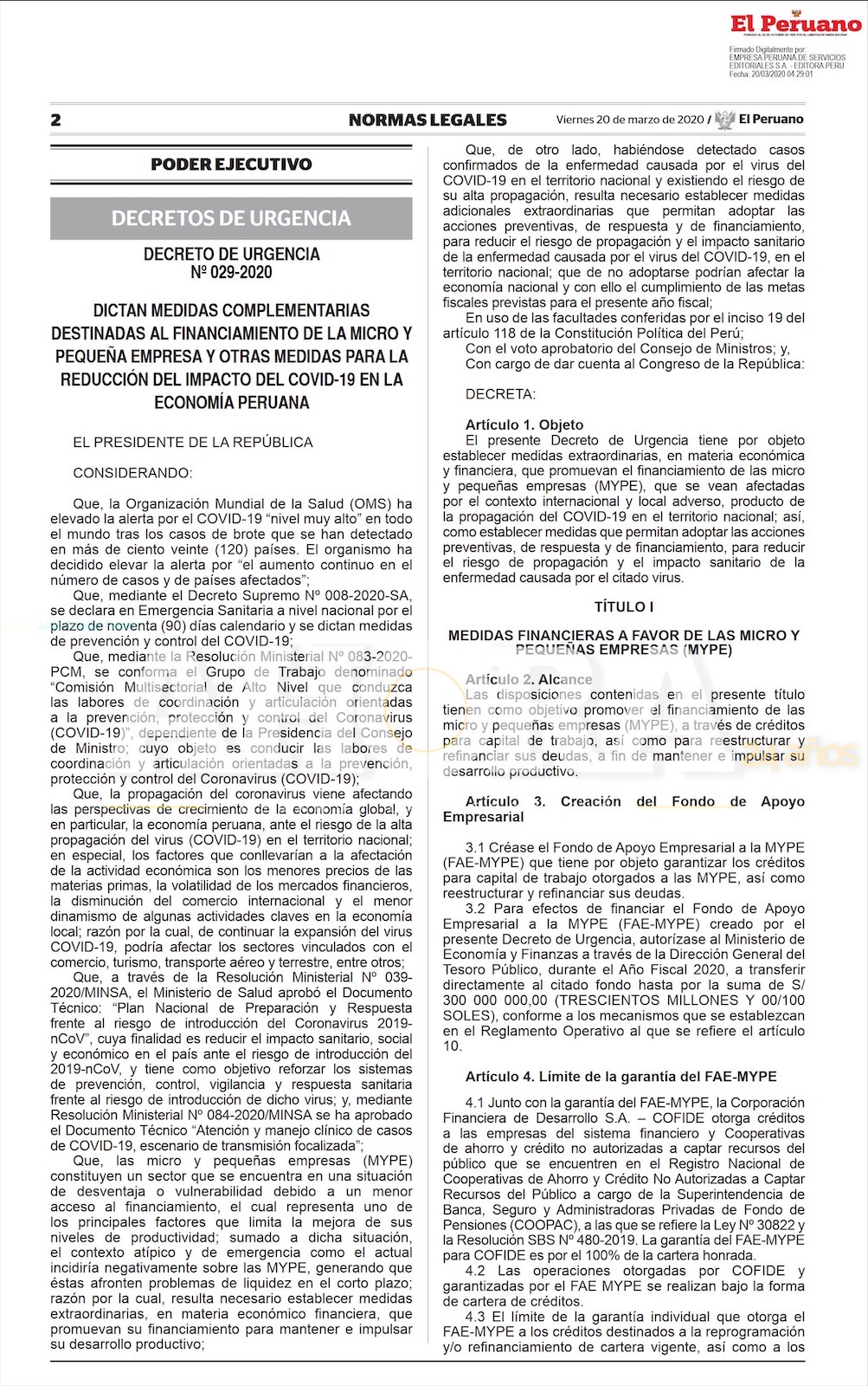 El Ejecutivo publicó hoy, en el Diario Oficial El Peruano, el Decreto de Urgencia 029-2020 por el cual se crea el Fondo de Apoyo Empresarial a la MYPE (FAE-MYPE). El objeto es garantizar los créditos para capital de trabajo otorgados a las MYPE, así como reestructurar y refinanciar sus deudas.