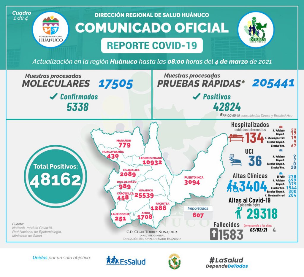 El último reporte de la Dirección Regional de Salud en Huánuco revela que los decesos por coronavirus se mantienen en descenso, en la actualización de este 04 de marzo a las 08:00 horas, indica que hubo 4 fallecidos por COVID-19.