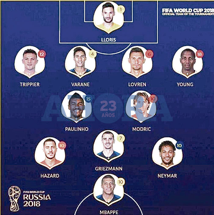 La FIFA ha hecho oficial el once ideal del Mundial de Rusia 2018. El mejor equipo del campeonato con la fórmula 4-4-2, es el siguiente: Lloris; Trippier, Varane, Lovren, Young; Paulinho, Modric, Hazard, Neymar; Griezmann y Mbappe.