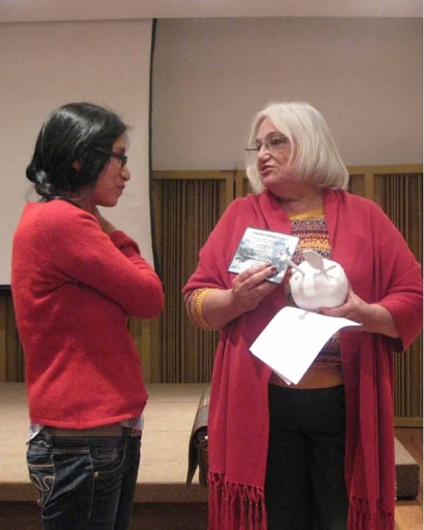 Nereida Apaza, comparte una fotografía con ella. “Esta foto es del año 2011, en el Británico Cultural, presentando una exposición llamada Jóvenes talentos. En esta foto le entrego un CD de música de mi padre” y le escribe este poema: Esa muerte individual / se alimenta de la verdad/ entonces/ comprendí ese dolor del cuerpo/ del corazón libre/ la gracia de ser un halo/ hermosa condición.