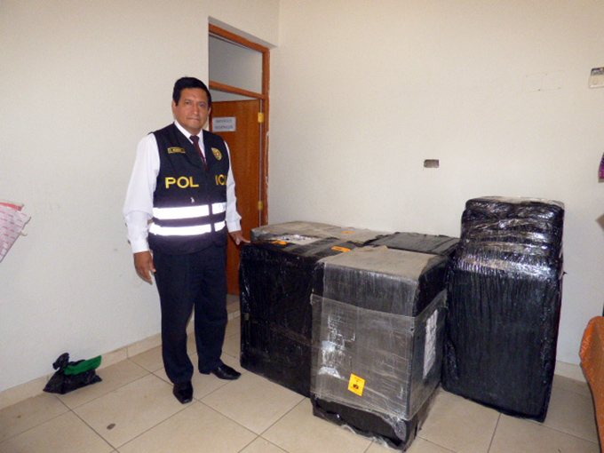 La Policía recuperó seis cajas que contenían 75 frascos de toner marca Lexmar, valorizados en S/65 000, pertenecientes al empresario Yesén Leonel La Torre Lizarzaburu (23).