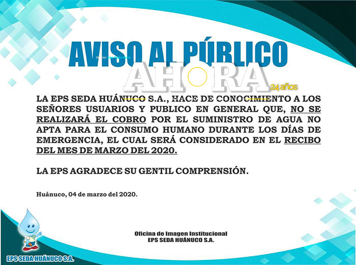 En un comunicado público en sus redes sociales, la empresa SEDA Huánuco dio a conocer que el descuento de 13 días en los que no se contó con el servicio de agua potable, se reflejará en la factura del mes de marzo y no en la de febrero como había informado el jefe de la Sunass, José Luis Paucar Balbín, en declaraciones vertidas el 21 de febrero.