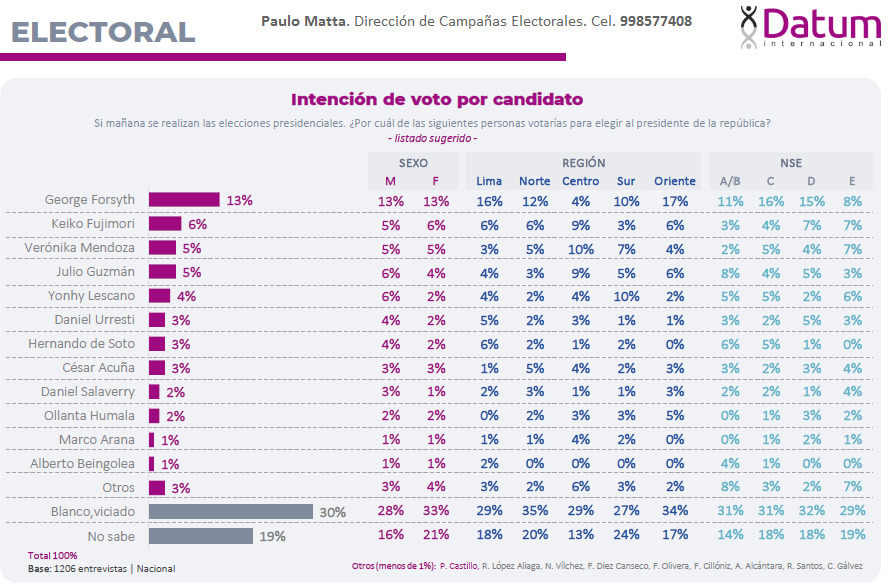 A solo tres meses de las elecciones generales de abril, la encuestadora Datum Internacional publicó su último sondeo de opinión en torno a la elección del futuro presidente de la República.