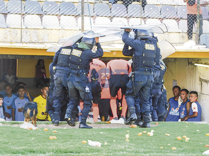 Al salir del campo, la terna fue despedida con una lluvia de botellas de agua y especialmente mandarinas que cayeron sobre el campo en un acto que se puede calificar de violento. Los policías que guardaban el orden hicieron un callejó con sus escudos para evitar que los árbitros reciban las pedradas.