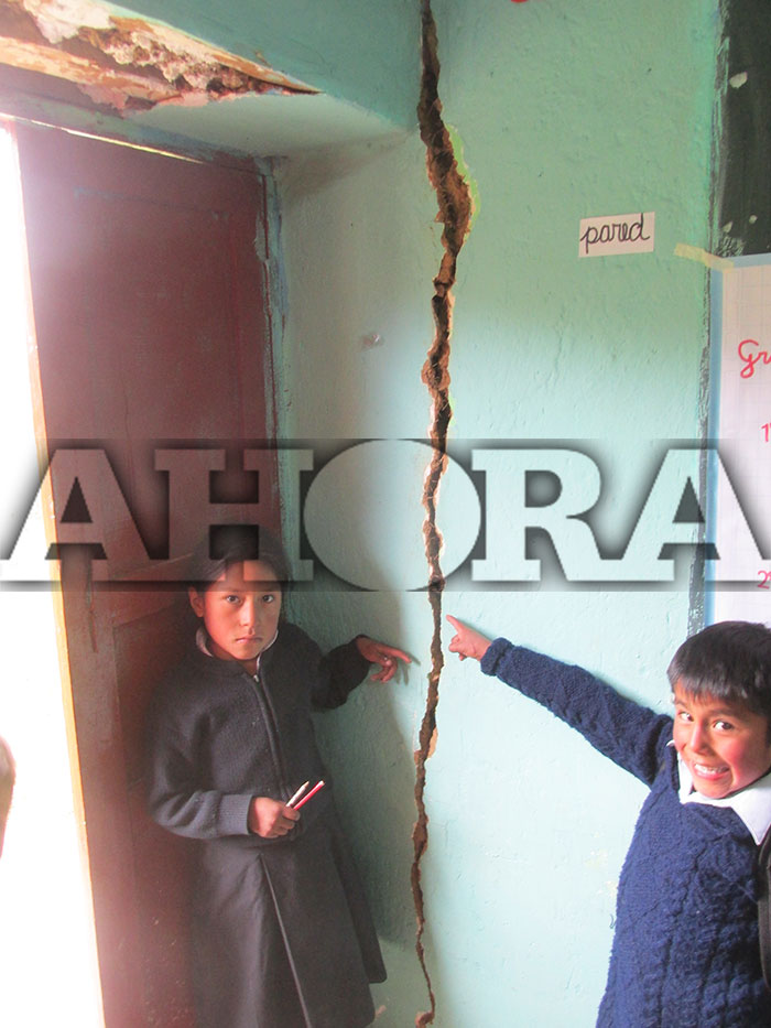 Las aulas y muro perimétrico hechos con tapial, enormes adobes de tierra apisonada, no cocido, que por efectos del último periodo de lluvias se han resquebrajado notoriamente, colocando en evidente peligro a alumnos y docentes por igual.