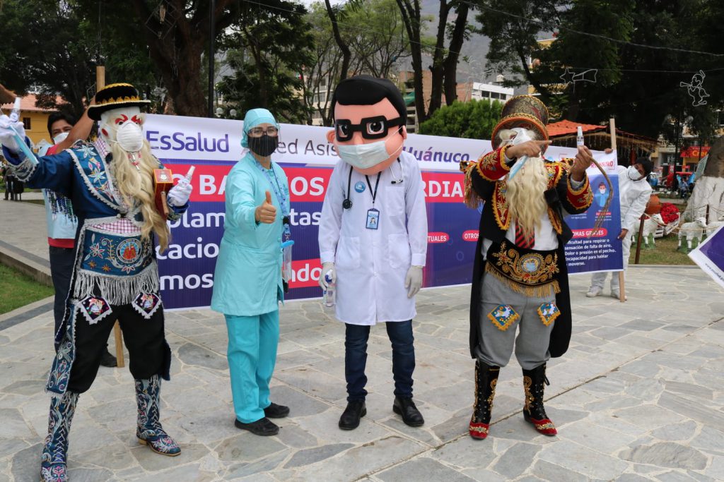 El personal de EsSalud en Huánuco y dos “corochanos” se unieron para invitar a la población a no bajar la guardia y continuar cumpliendo las medidas de prevención que se han establecido para evitar el contagio del coronavirus.
