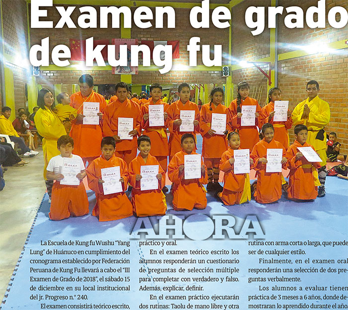 La Escuela de Kung fu Wushu “Yang Lung” de Huánuco en cumplimiento del cronograma establecido por Federación Peruana de Kung Fu llevará a cabo el “III Examen de Grado de 2018”, el sábado 15 de diciembre en su local institucional del jr. Progreso n.° 240.